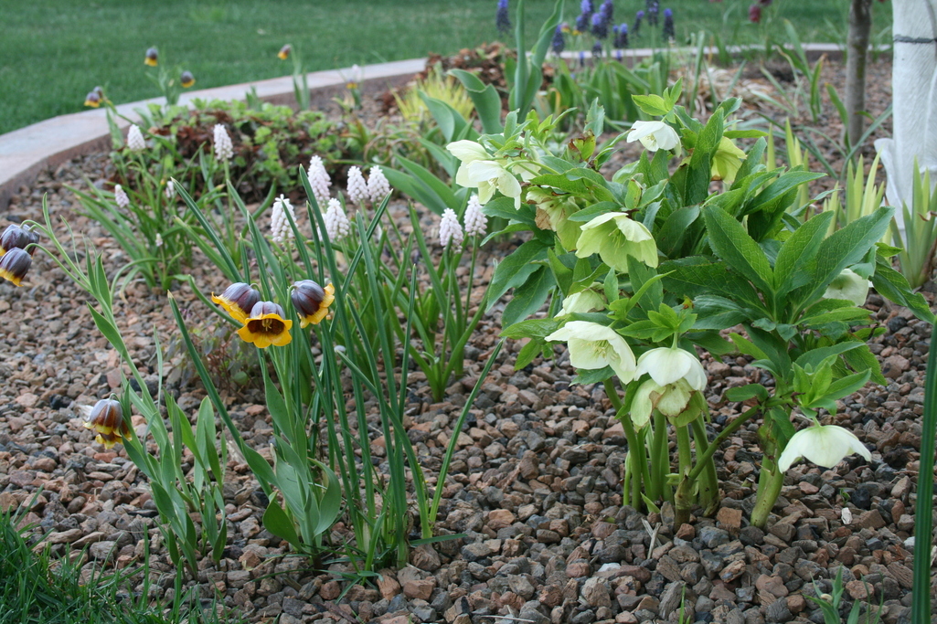 クリスマスローズとフリチラリア・ミハイロフスキーとムスカリ ’ピンクサンライズ’のトリオです。