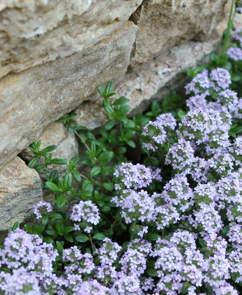 小さくてモコモコのタイムの花と石壁。相性バッチリでとっても素敵!