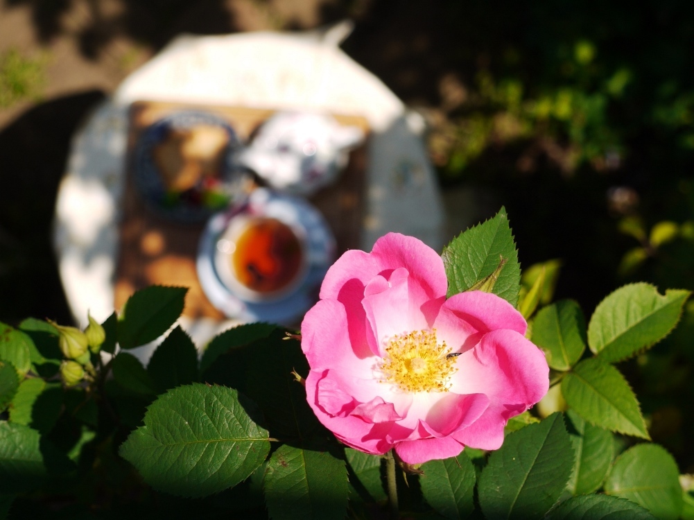 バラの向こうにティーセット、お邪魔したくなります(*^^*)