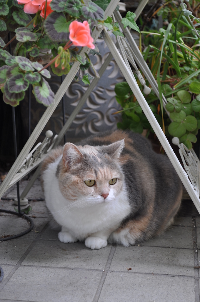 ガーデンテーブルの下に落ち着いたみーこ。