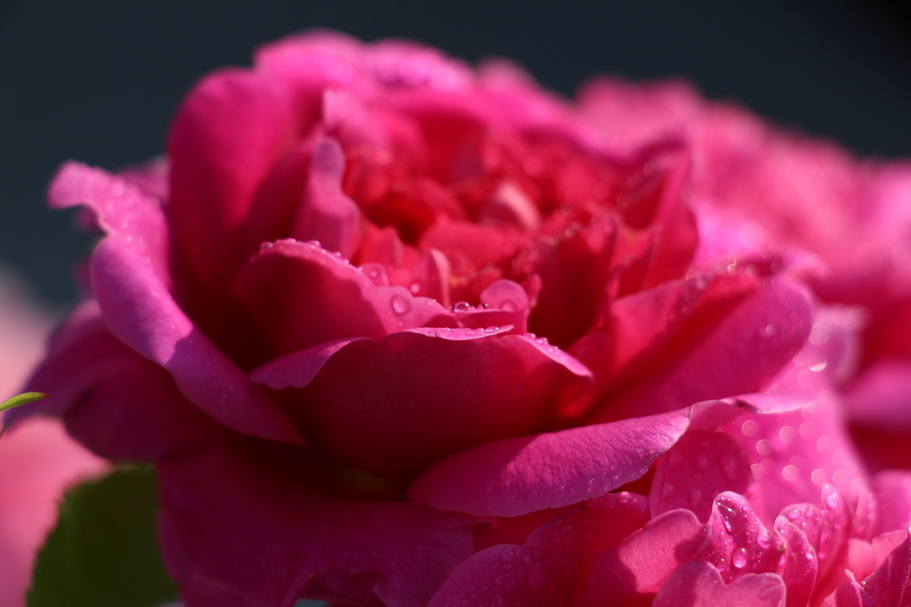 早朝の露の感じがいいですね! 太陽の日がやわらかい朝 水滴が付いた花弁活き活きとしてパワーがアップ? 赤い屋根は葉が落ちた秋の終わりに