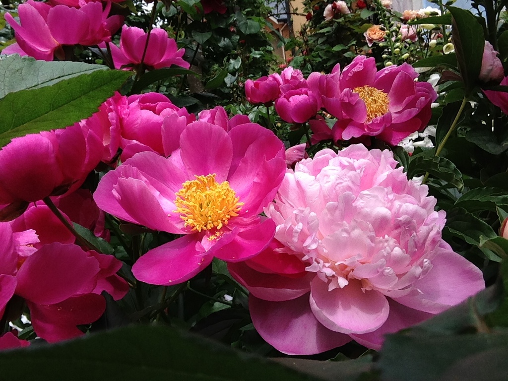芍薬の向こうに薔薇、なんと、華やかなんでしょう