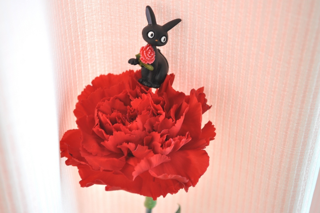 魔女の宅急便のジジがちょこんとついたカーネーション。ジブリショップで買いました。