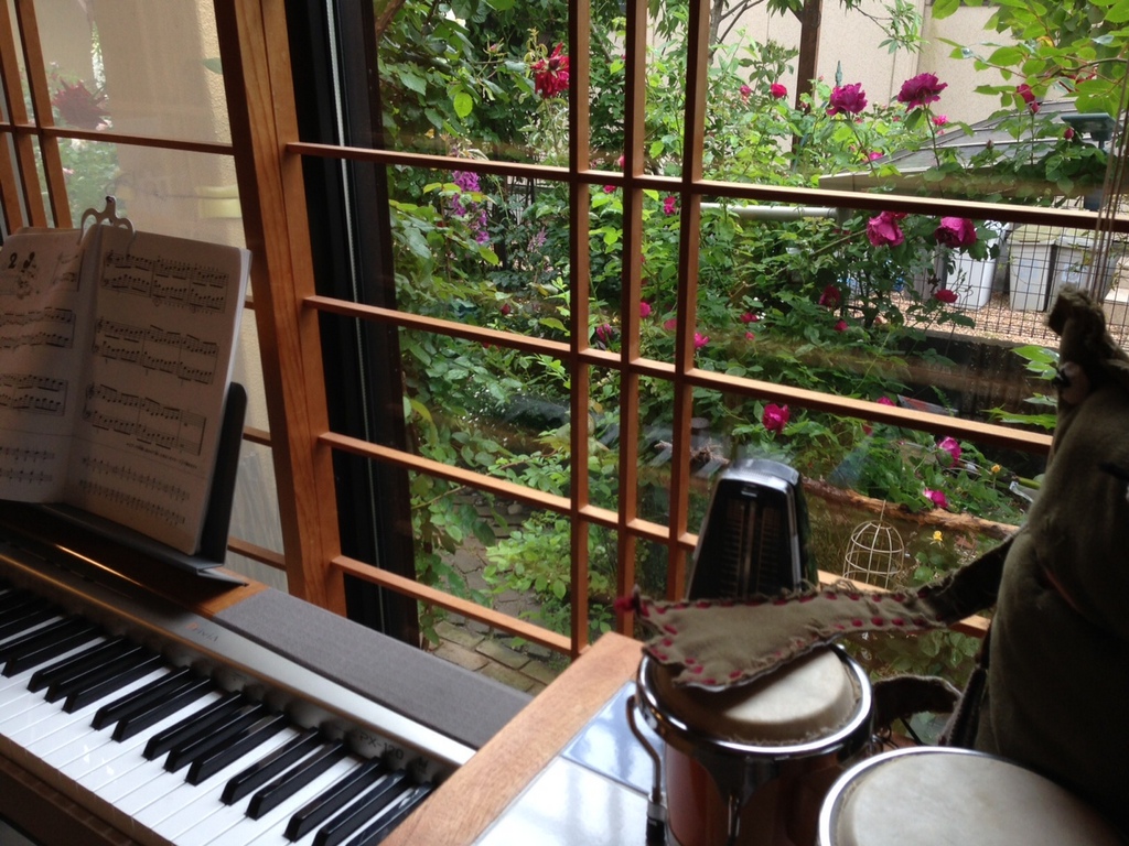 子供はピアノの練習をする時見える真っ赤な薔薇のアンクルウォーターがお気に入りです。正面にバロン ジロード ラン、その右手に黄色のつるミセス ピエール S デュポン。