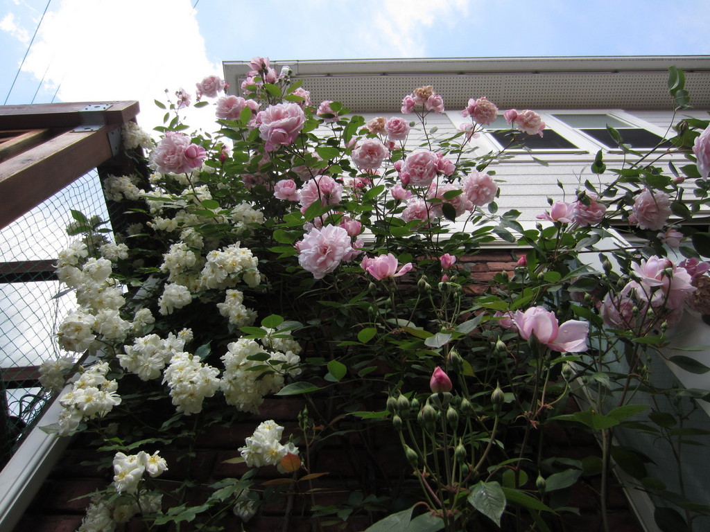 隣との境に植えて2階に誘引させていますが、風通しが悪く毎年虫食いがひどかったのですが、忘れず水やりをしたら元気に育ちました。軒下があると雨水がかからないので、やはり水やりが重要だと実感しました。ここにもたくさんのテントウムシの幼虫とヒラタアブの幼虫がアブラムシを食べてくれています