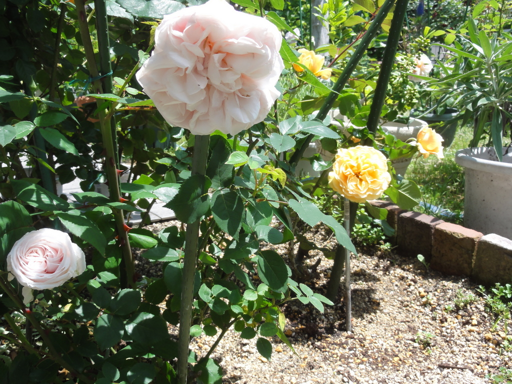 黄色いバラはF アンバー・クイーン、玄関前に植えている少し高めのS-ER ザ・ジェネラスガーデナーの横に低めのスブニール・ドゥ・ラ・マルメゾンとアンバー・クイーンを植えてみました。