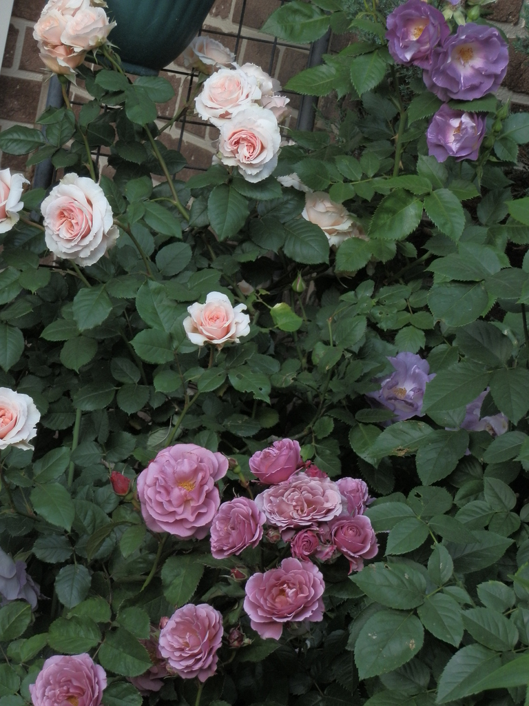 絆、ブルーフォーユー、あおいのコラボ♪鉢植え栽培なので咲いた順に目立つ位置に持って行きますのでその時々であわせる薔薇が違います。統一性が無いけど、それも楽しんでます♪