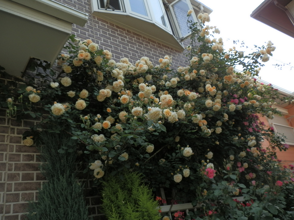 日照2時間のコンテナガーデンです。駐車場の片隅での薔薇栽培ですのでスペースが無い為、大きくなるツルバラは建物に誘引しちゃってます♪