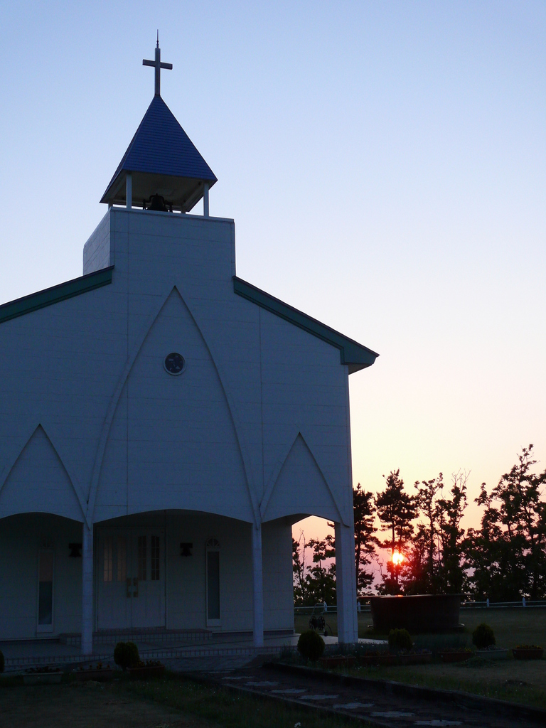 近所のチャペルは、夕日がバックのシルエットが絵になります、高台から見える夕日は美しいです、この景色に感動し秋田の岩城という少し田舎に移り住みました。