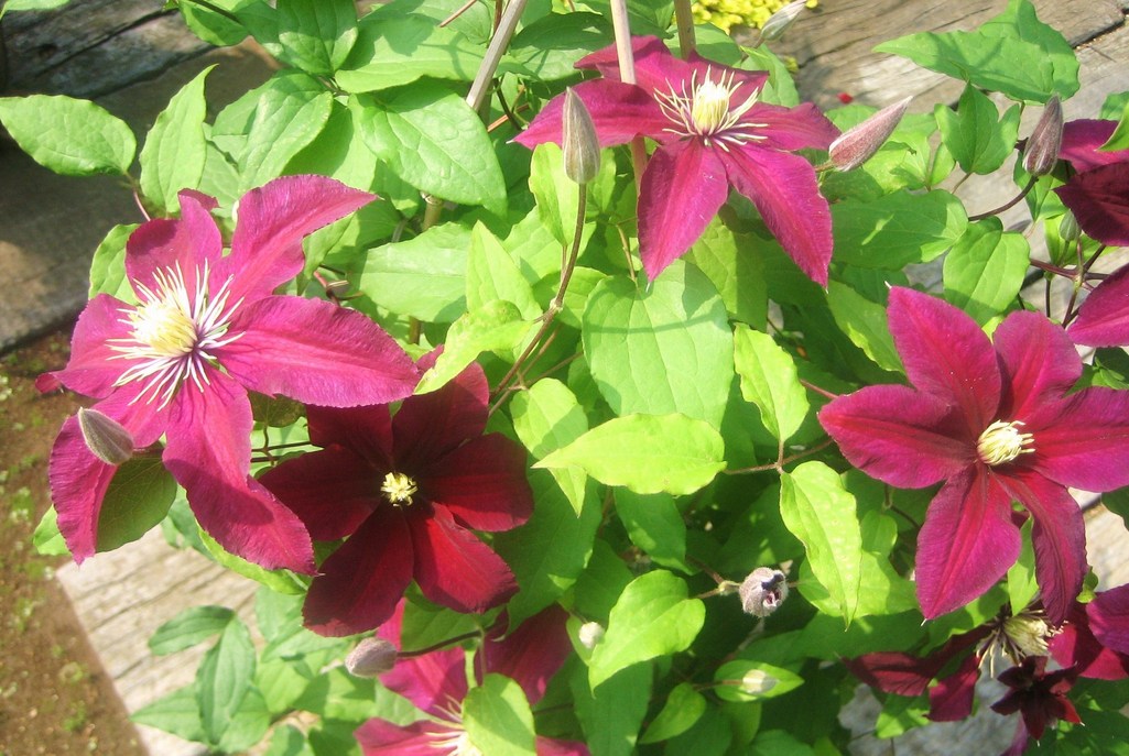 ビロードのような質感、臙脂の花弁と黄色の花芯のコントラスト、シックで華やか、丈夫なクレマチスです。