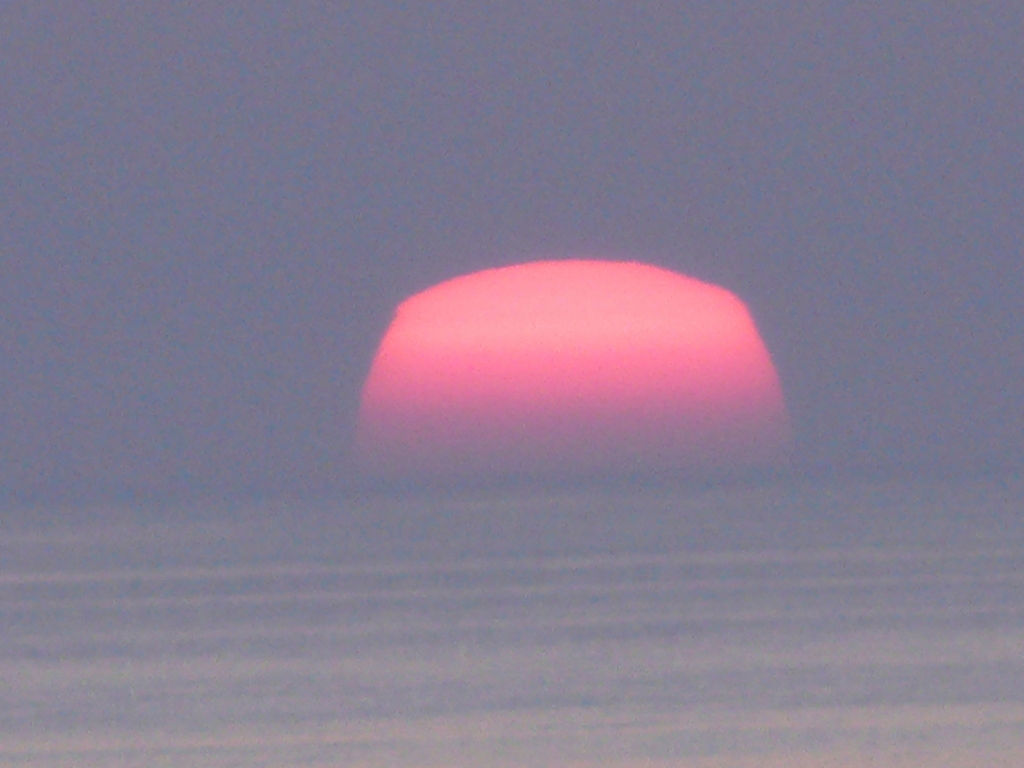 蜃気楼のような夕日ですね。とても素敵な景色です。