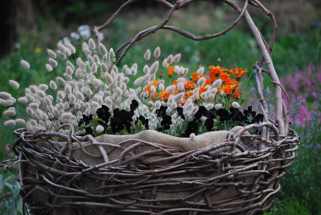 2月に自然素材で編んだ籠にデモルフォセカオレンジラグラスバニーテールブラックビオラ今年は寒かったのでビオラがギュッとしたままです。