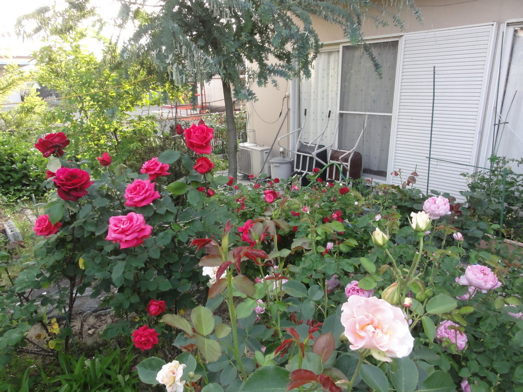 中庭で大輪の赤いバラが咲き始めました。HT ヘルムット・コール・ローズ、S ロココ、OD-Misc.ODR ツダンホンシン、S-ER チャールズ・レニ・マッキントッシュ