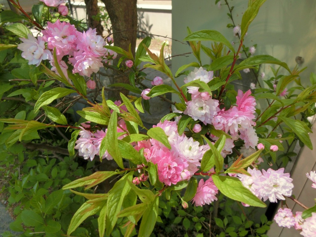 散歩中に見かけた可愛い八重桜の様な花をつけた1m位の小さな木。どなたか名前を教えてください。