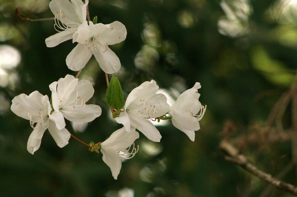 近所の道路沿いの大きな木の木陰に、真っ白なツツジが咲いていました。