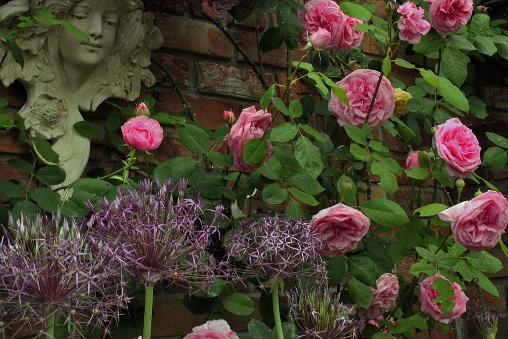 強いバラの香りでベンチ周りを包んでくれるガードルード・ジェキルと、紫の星がたくさん輝くアリウム・クリストフィー