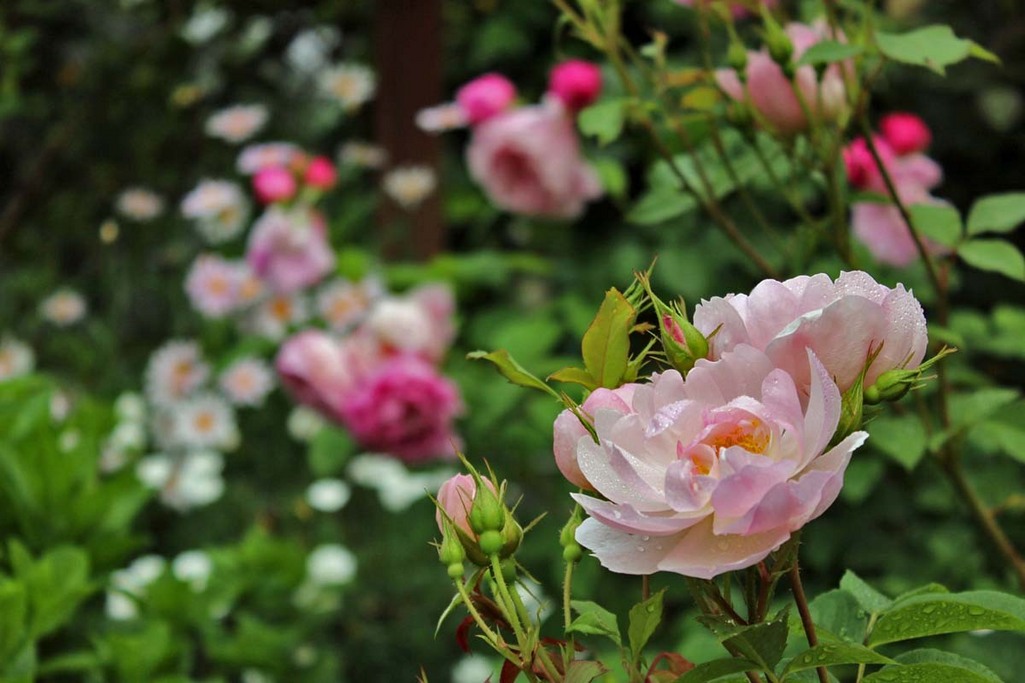 冬まで咲き続ける大好きなバラ、スキャボロフェア ・・・・背景はメアリー・ローズとポールズ・ヒマラヤン・ムスク、それにマーガレット