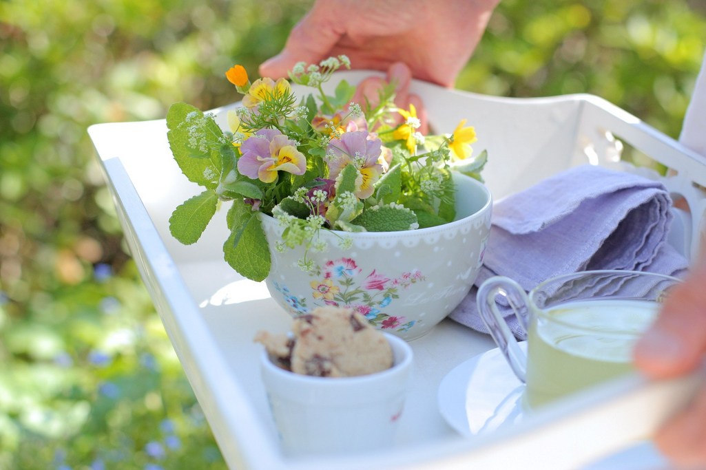 小さなビオラを摘んで、ハーブと合わせてカフェオレボウルにアレンジ。