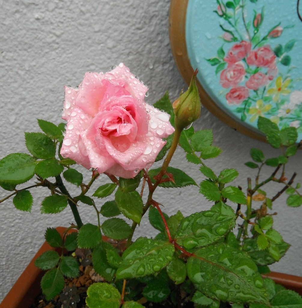 表札は、バラのお庭を夢見て、2年前に書きました。昨年のバラの季節から、夢が実現できてきて、うれしいです❤ミニバラさん。。。雨に濡れてしまったけど。。。本当に、きれいな子です❤