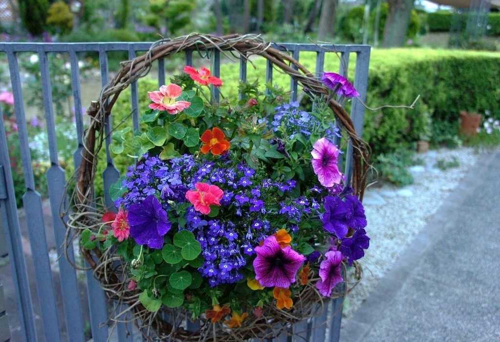 ブルーがメインのハンギング色使いがとても素敵です。背景も最高ですね。私なら単純にブルーと白でまとめてしまいそう。