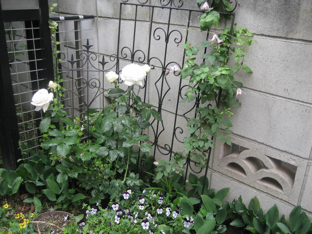 ピエールドローサンヌとビオラとクレマチスが絡んでいます。