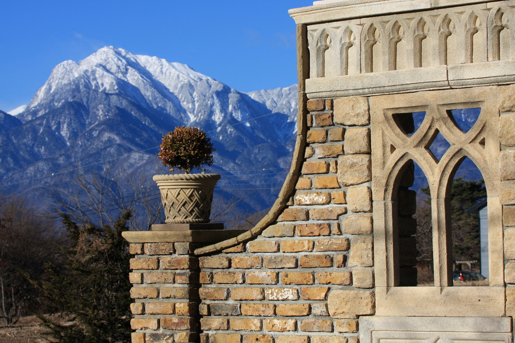 素敵な煉瓦越しに見えるうっすら白い甲斐駒ヶ岳が、とっても素敵ですね。朝の清々しい感じが伝わってきます。