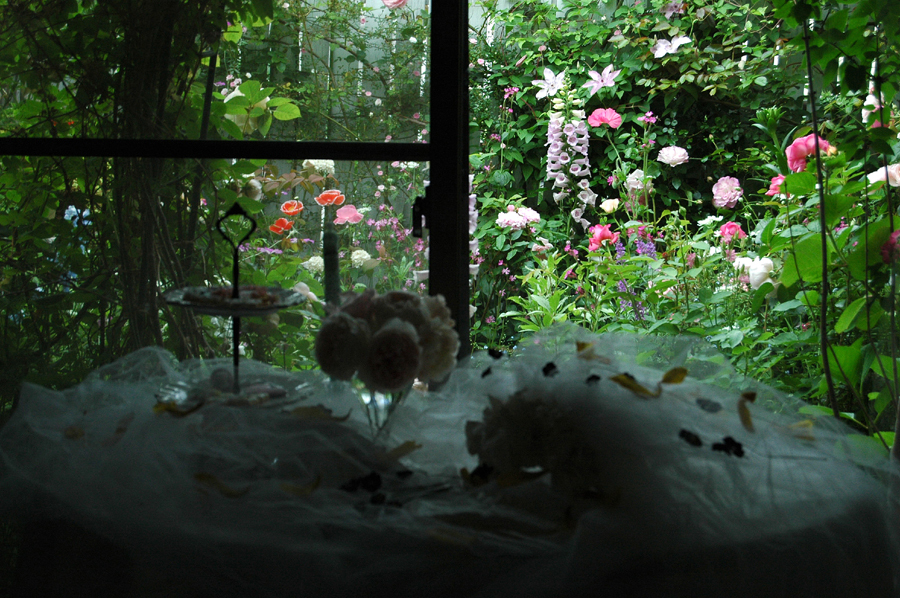 窓越しから見る色とりどりのバルコニーのお庭風情があります。本当にそこに座っているみたい。