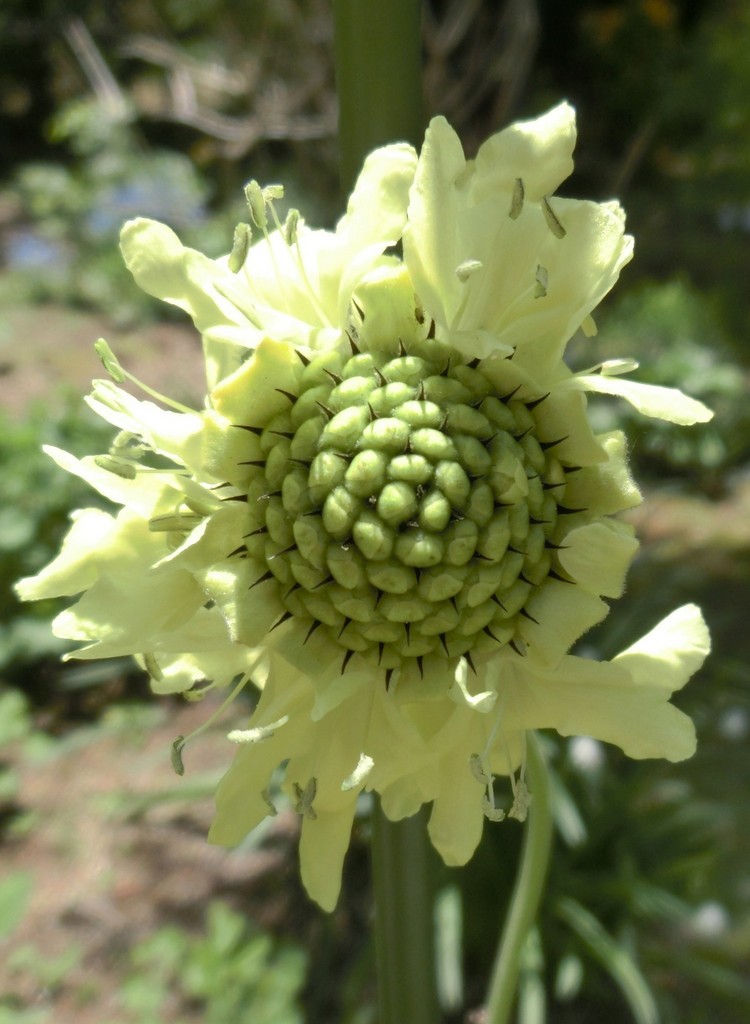 蕾が開花するとクリーム色の花びらが開き始め、いかにもマツムシソウらしい形になります。
