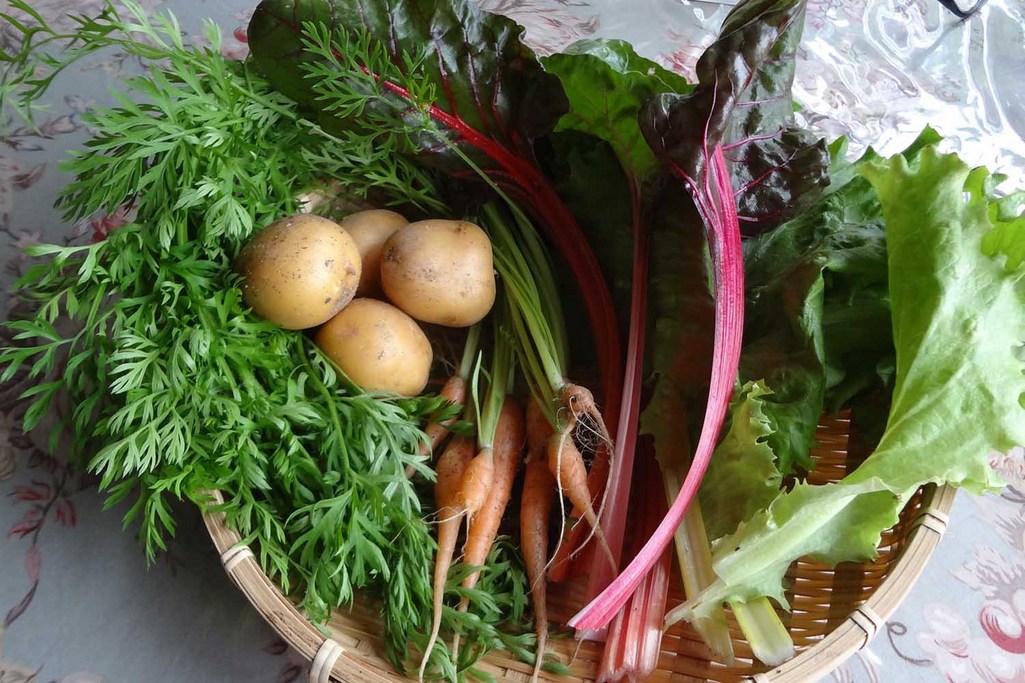 誰もお料理してくれないので、ちょっとカンタンクッキングデス。人参の葉っぱはちりめんじゃこ炒め、小指サイズの人参はそのままボリボリ、ジャガイモはカレー、スイスチャードの茎はスティックサラダ、葉っぱはおひたしでいただきましたヨ〜