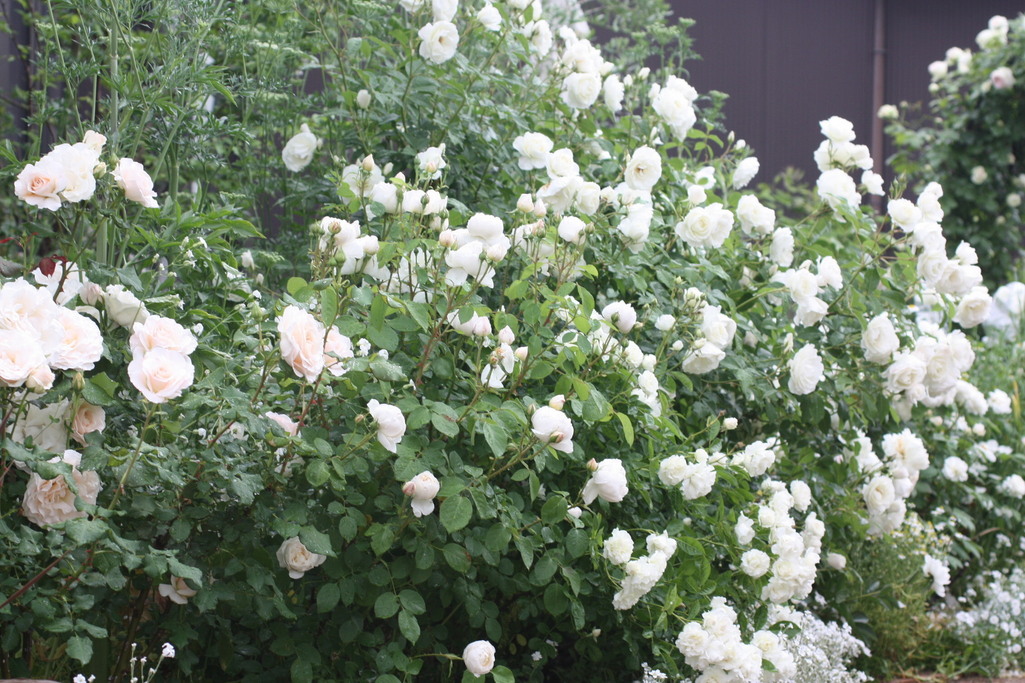 白バラばかりのコーナー、あこがれです。見事にきれいに咲いていますね。