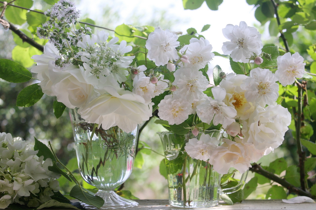 あえてまとめようとせず透ける感じを表現。我が家のポールズ・ヒマラヤン・ムスクは白です。たまに桜色の花が混じることもあります。