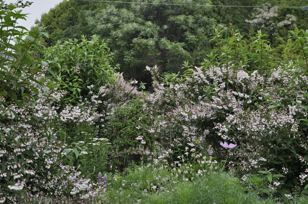 すっかり目隠しをしてくれた空木遠くに見えるのは 栴檀のお花です。空木の下にはピンクカスミとコスモス
