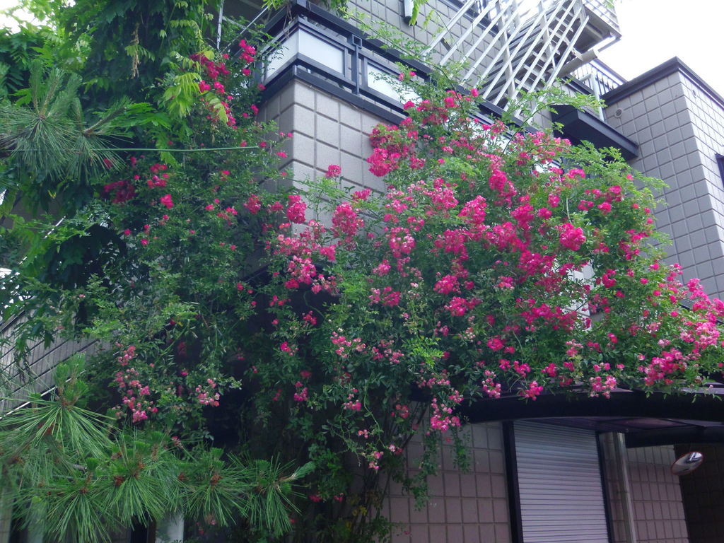 たっぷりと広いスペースに誘引されて、幸せなつるバラですね^^
