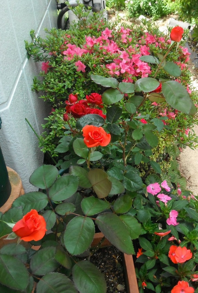 レディローズさん。あうんの心のバラさんです。中央の濃い目のサーモンオレンジというのか。。。スーパースターさんよりも、鮮やかな色合いです。この色を、デジカメで、どうお伝えすればよいのやら。。。(笑)一度他の株が、満開になりましたが、花形が、今年は今のところ。。。今ひとつかな。。。でも大好き!