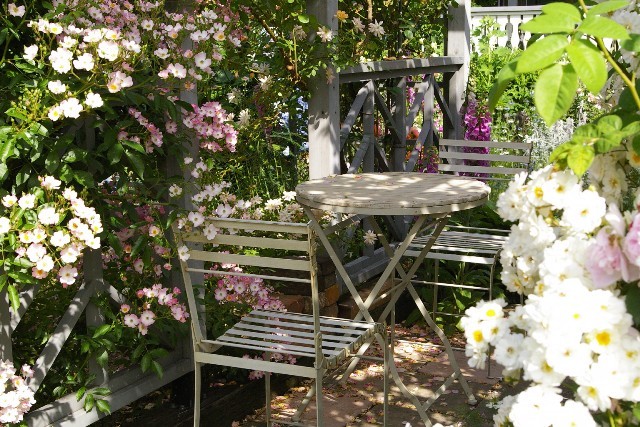 淡い色合いのバラに囲まれて、木漏れ日の下で素敵なひと時が過ごせそうですね。