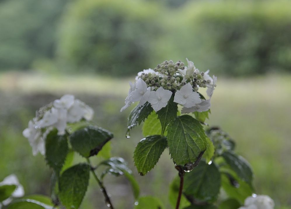 庭かげにひっそりと咲く紫陽花の花がいじらし