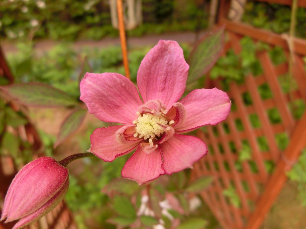 パーゴラのクレマチスはモンタナ系で濃いピンクで可愛い花ですが、名前はわかりません。