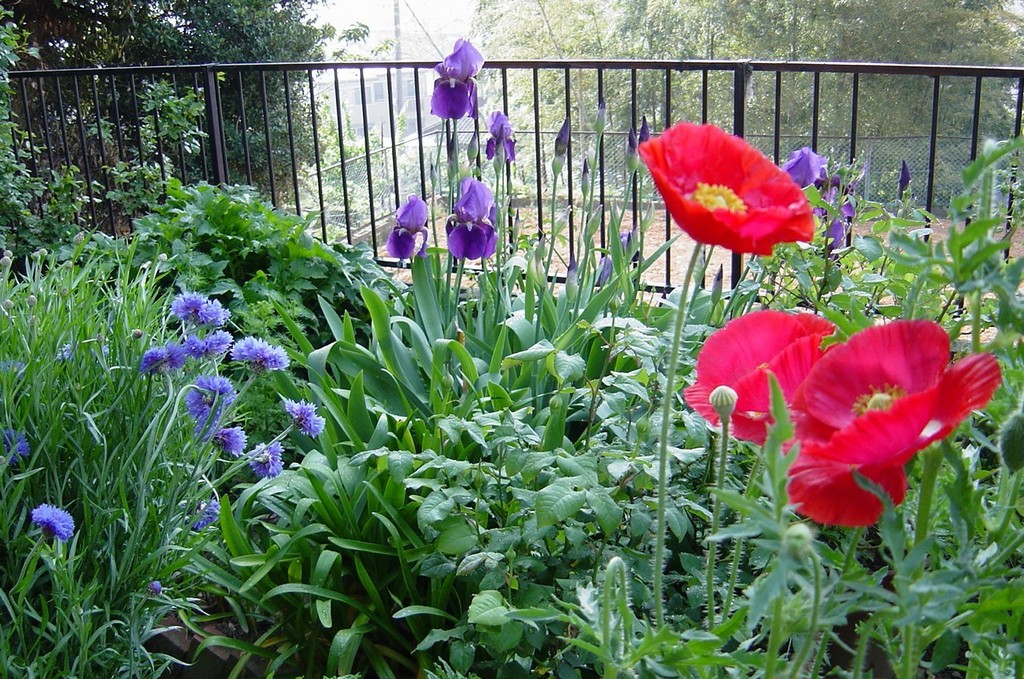 赤いポピーとブルーのアイリスや矢車草・・・色あわせがいいですね。