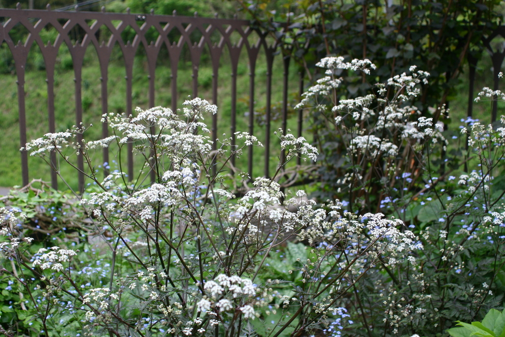 フェンスと花の茎の濃い色が、花の白さと対照的で、シックな雰囲気の素敵な一枚です。