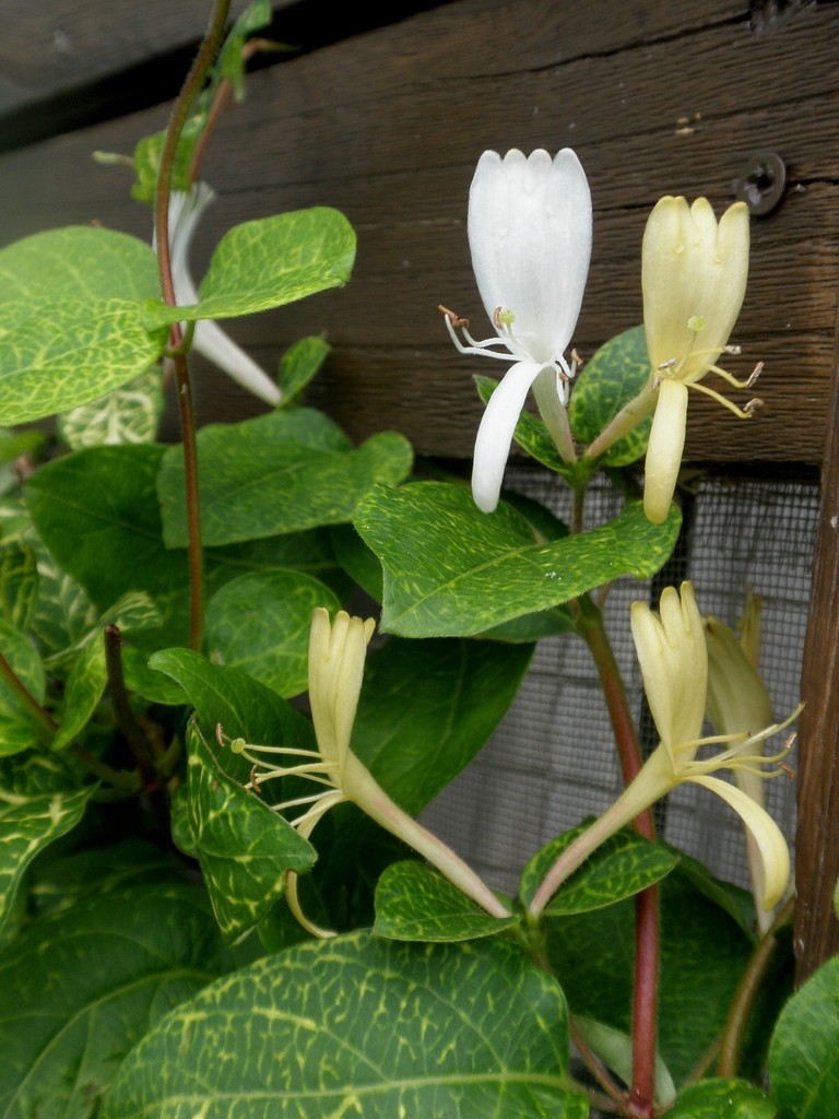 うちにも同じハニーサックルがあります。地植えしてから花が咲くまでに3~4年かかりましたが、今ではツルを旺盛に伸ばしてたくさん花を付けるようになりました。白からクリーム色に変化する花色、香りもよく私も大好きなつる植物です。
