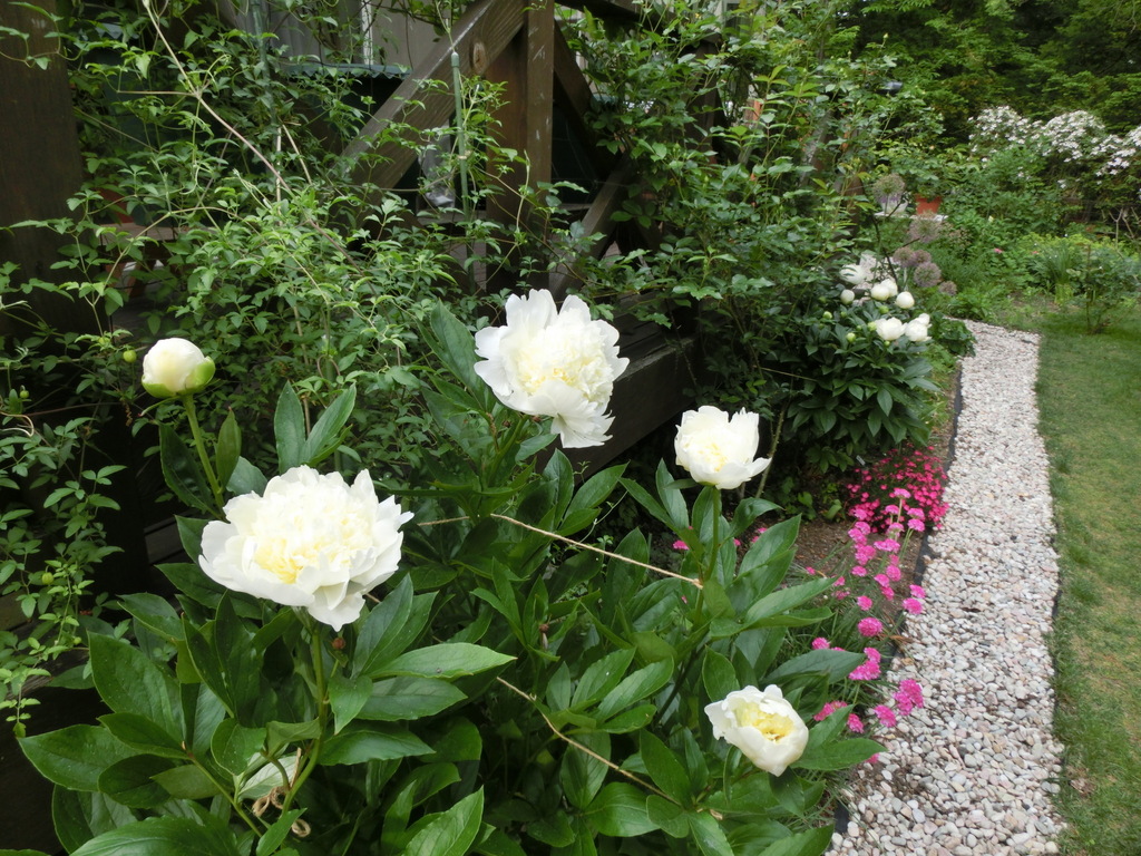 いまシャクヤクとアルメリア、ナデシコがきれいに咲きそろってきました。手摺りに這わせたクレマチスとバラのアイスバーグ、ピエール・ド・ロンサールはまだです。
