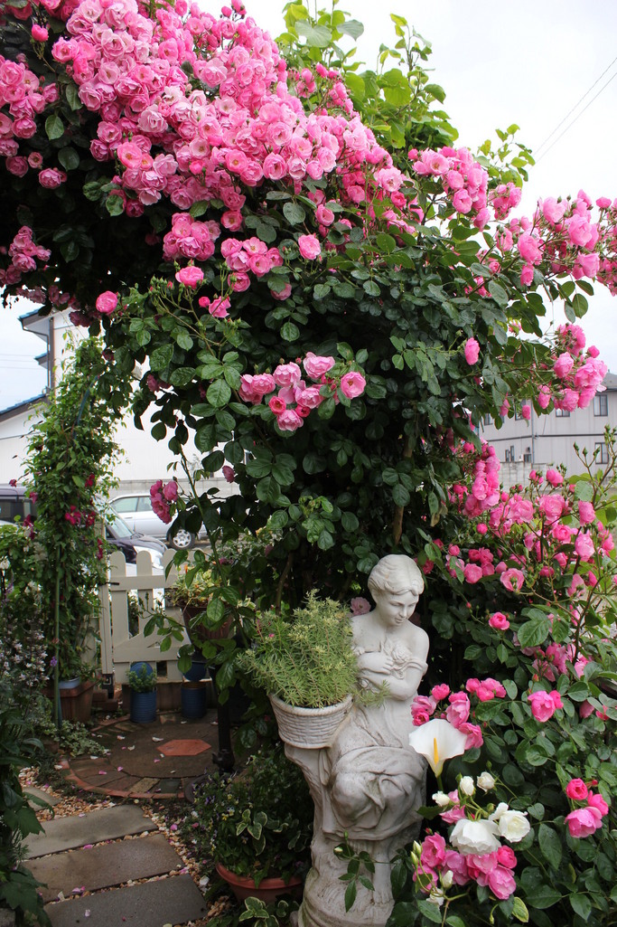 アンジェラのアーチ前でいつもお庭を見つめてくれる我が家の姫です。今日はアンジェラの前に咲くアイスバーグとカラーに話しかけているようですね!