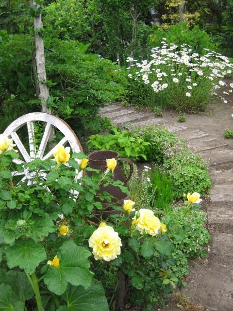 アンティークの小物とピッタリですね。お互い引きたてあっていてお庭がセンスアップされているみたい。黄色と白の組み合わせがロマンチックですね。