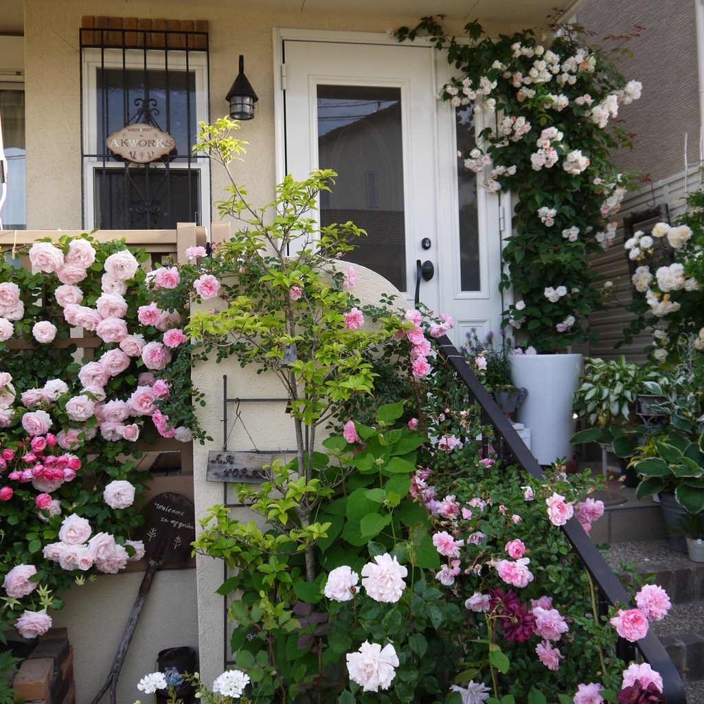 今年初めて家に壁面誘引してみた、トレジャー・トローヴ。作り始めて3年目の庭・・・。