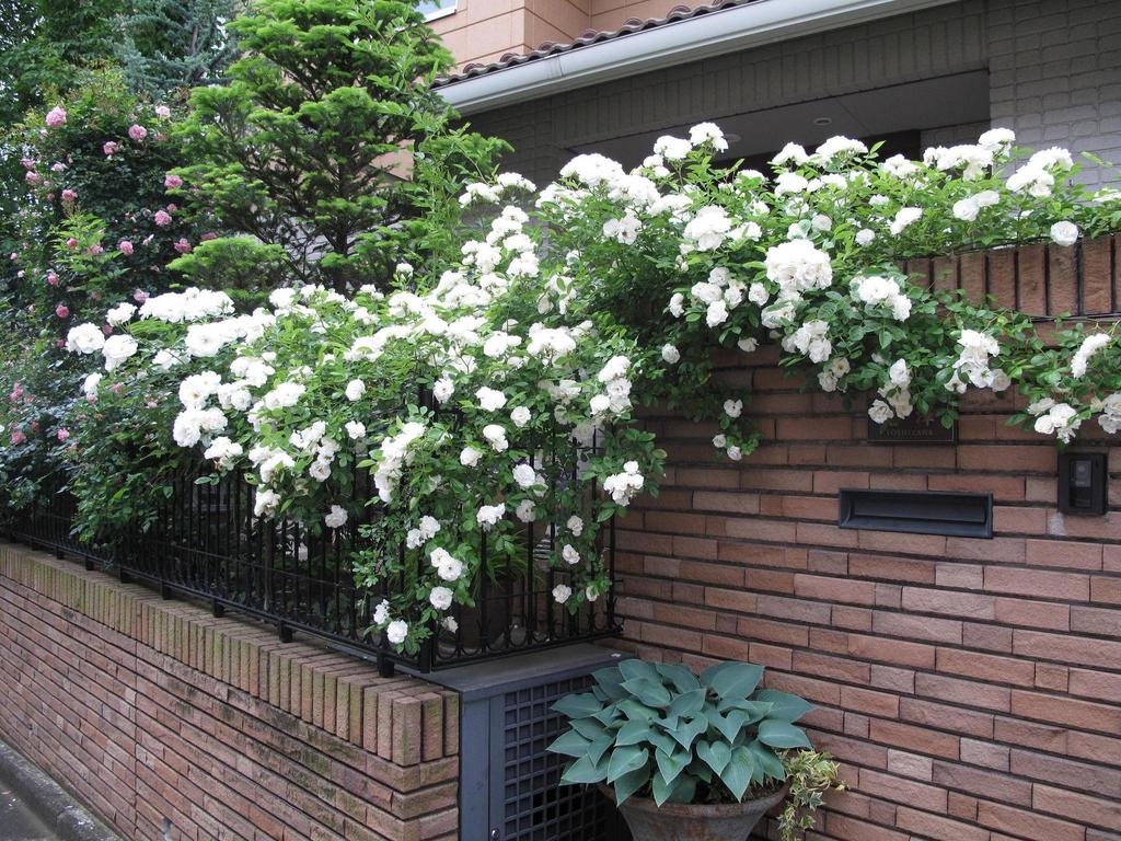 北側の門柱に誘引されて静かにお客様をお迎えします。