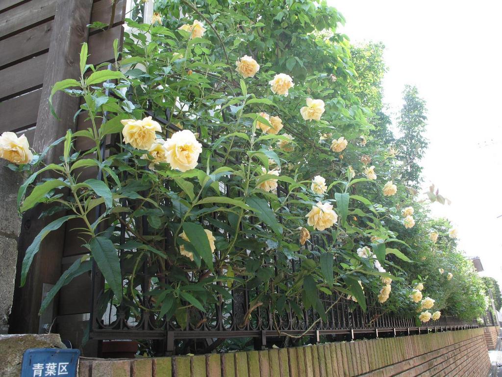 長~いフェンスの最後です。大輪の花で、北側ではもったいないくらいきれいです。でもこの咲き方がうつくしいのかも・・