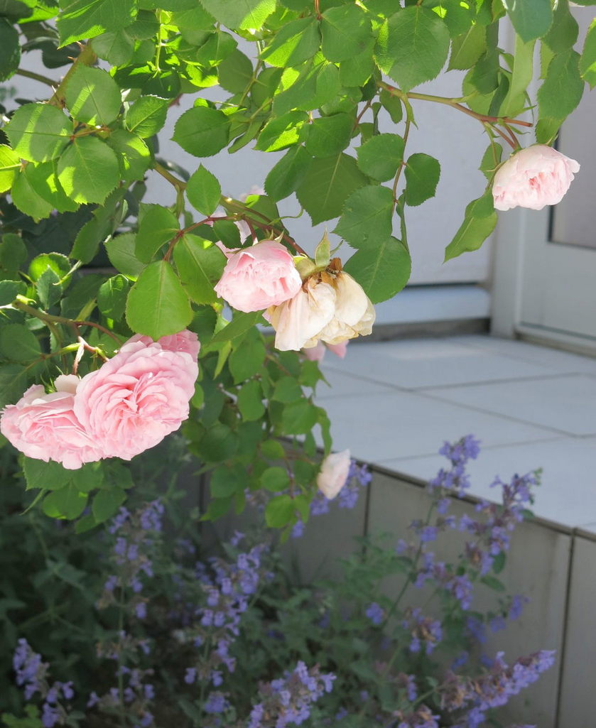 マリアテレジアとキャットミントの淡い色の組み合わせ。半日陰ですがたくさん花を咲かせています。