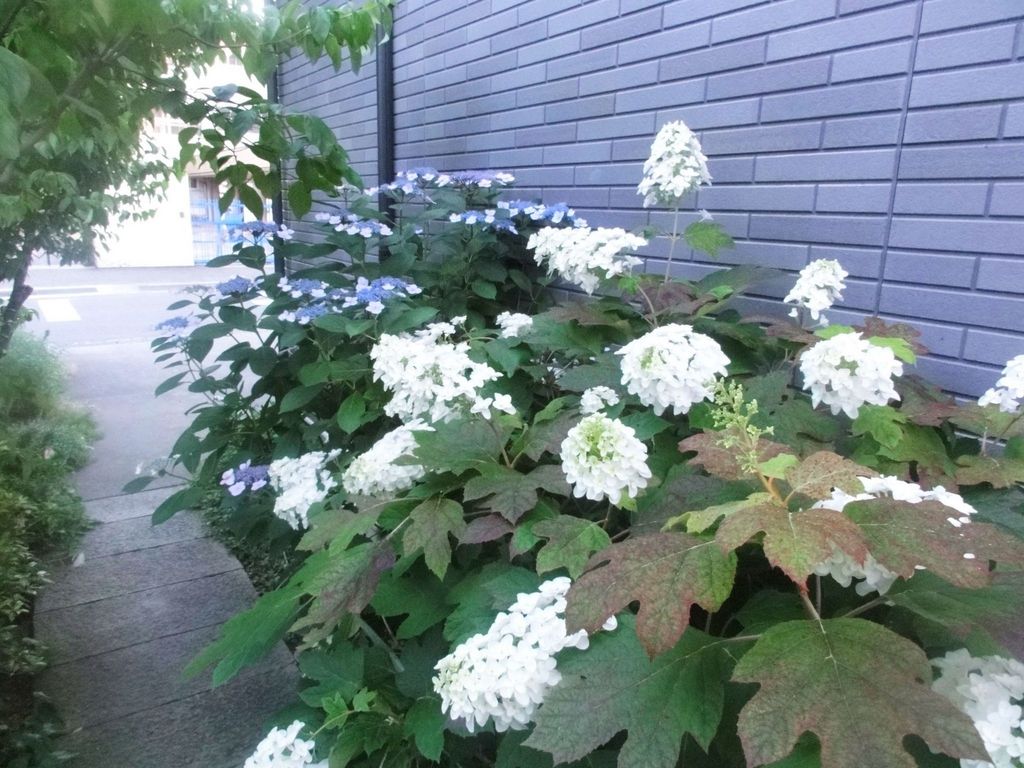 青い額アジサイと白いカシワバアジサイ、毎年同じ時期に咲いています。