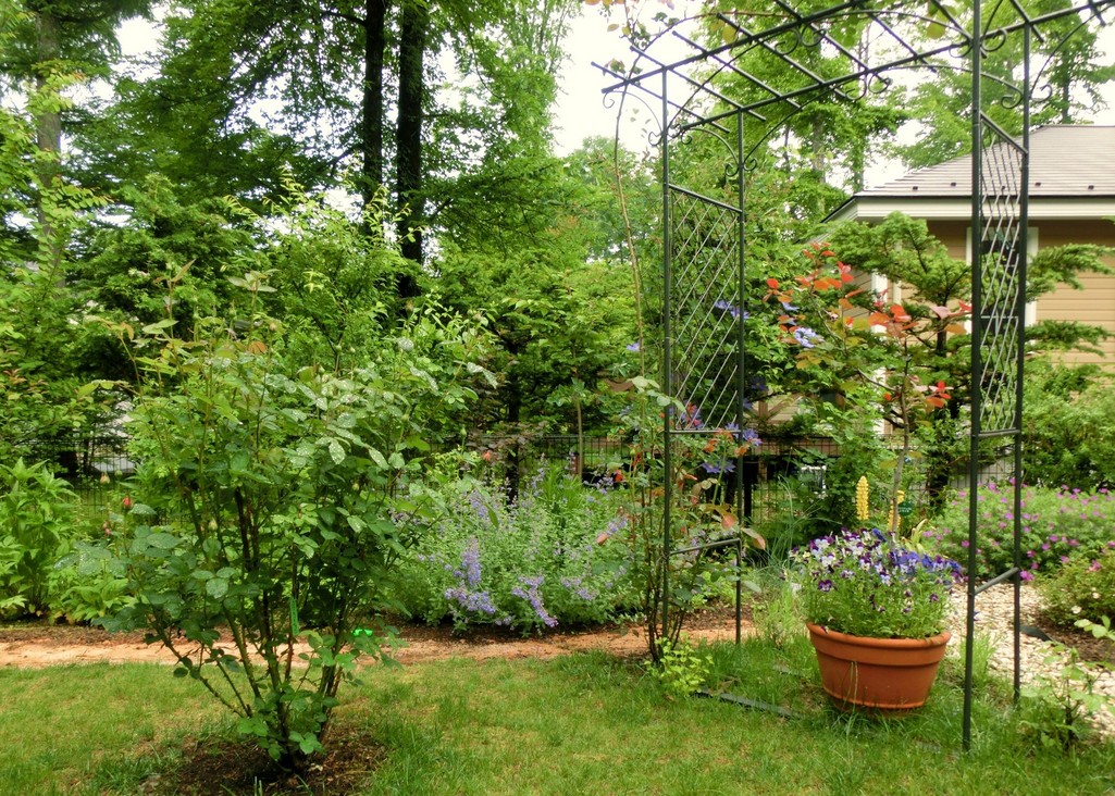 左のバラはアルンウイック・キャッスル。だいぶ蕾が膨らんできました。スチールのパーゴラにはロココを絡めています。