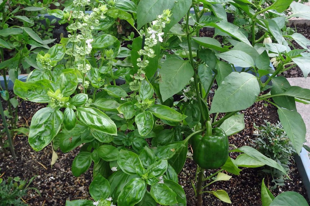 知らないうちにバジルに花が咲いちゃいました。パプリカの実もついてるけど、これ何色になるんだったかな?